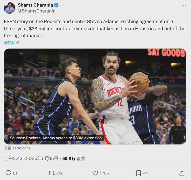 很多火箭球迷,宁可让球队交易申京和杰伦-格林,也不想放走亚当斯。火箭下一个要解决的是范乔丹,火箭必须在6月30日之前决定,是否执行下赛季4489万美元的球队选项。火箭能重新续约,也可以放走范乔丹,再追其他后卫。