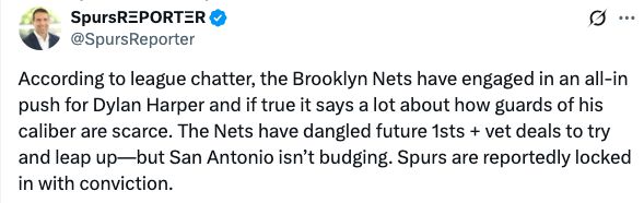 雷速体育6月15日讯 据马刺记者Dusty Garza报道,篮网正全力追逐迪伦·哈珀。